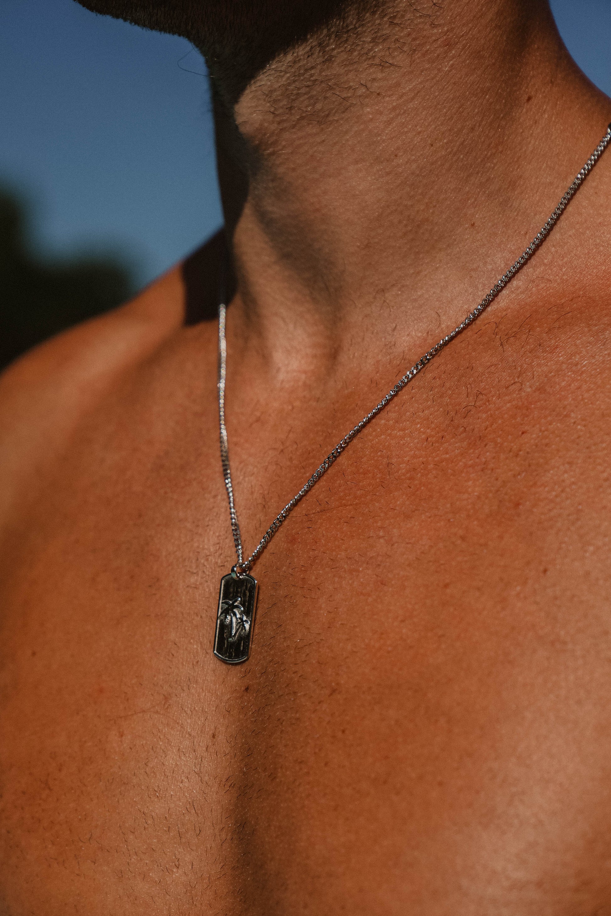Introducing the Island Dream Dog Tag Necklace – your connection to the beach, crafted from high-quality 925 sterling silver. This unisex necklace features a sleek dog tag pendant engraved with a tropical palm tree design, capturing laid-back island vibes.